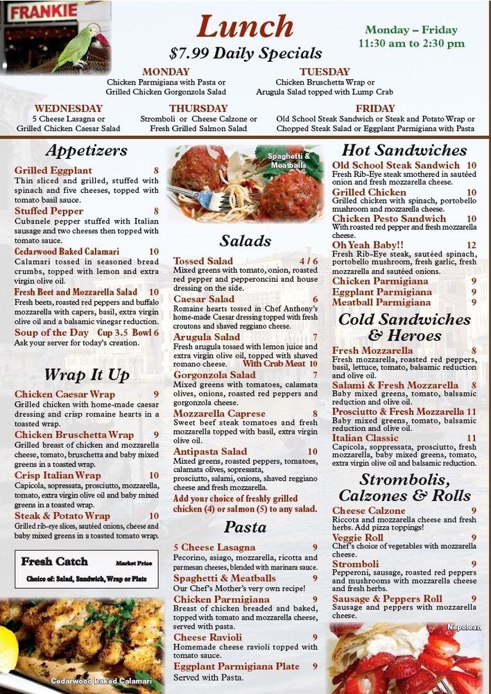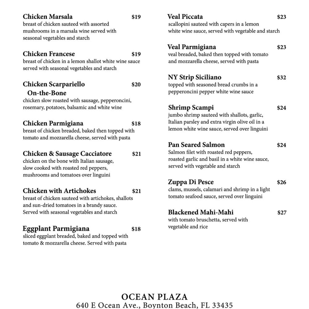 Entrees available (dine-in, takeout and delvery pm to close) served with starch and vegetable or chef choice of pasta